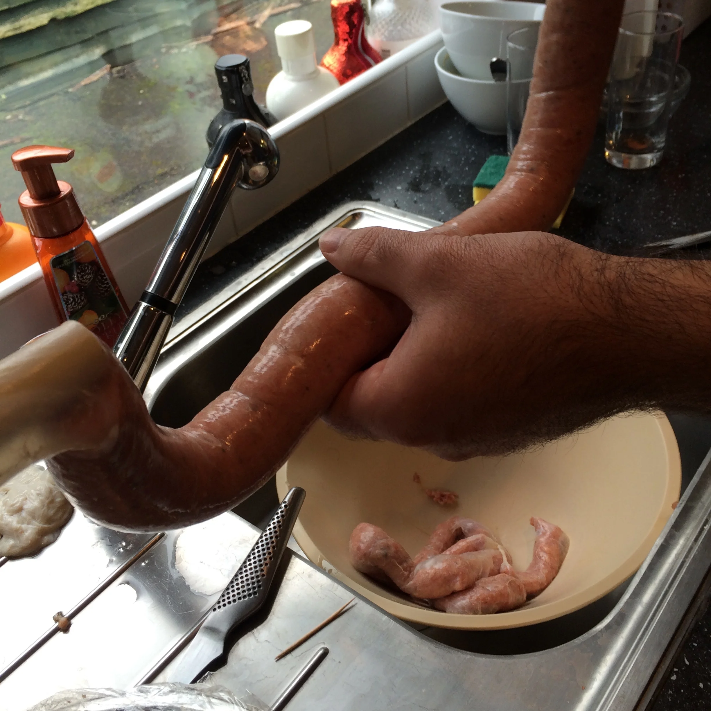 Natural pig casings require a thorough soaking to rid them of salt, and smell (you have been warned). Leave to soak in warm water whilst you get on with the filling.